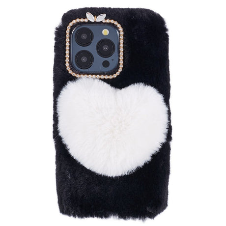 iPhone 15 Pro Fleksibelt Plastik Bagside Cover m. Pels - Hjerte - Sort / Hvid
