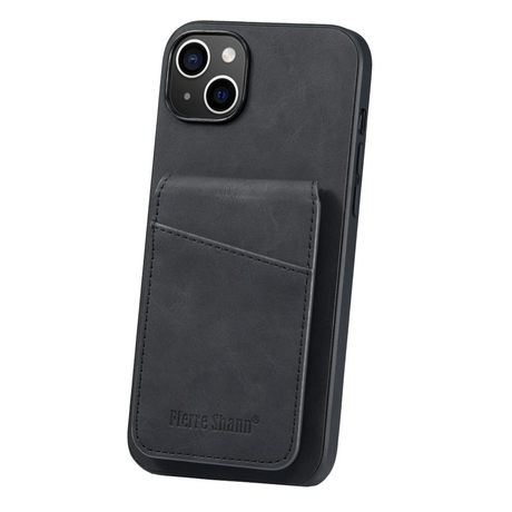 iPhone 14 Skinnbelagt plastbakdeksel m. Kortholdere og stativfunksjon - Sort