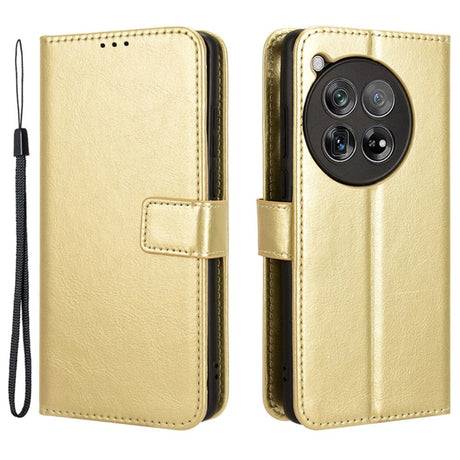 OnePlus 12R glanset lær flipdeksel m. Lommebok og stropp - gull