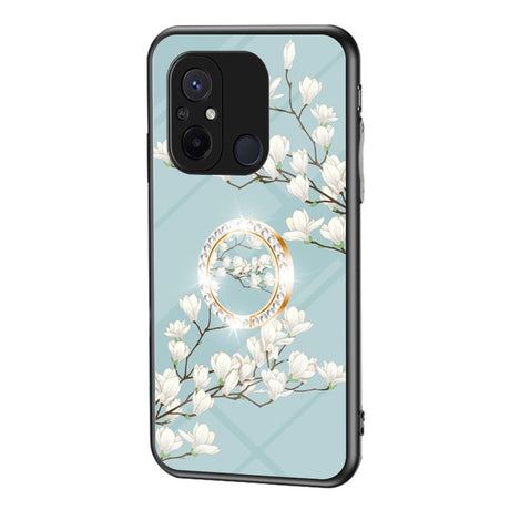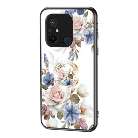 Xiaomi Redmi 12C plastbakdeksel m. Glass rygg & magnetisk støtte / fingerring - hvit m. Blomster