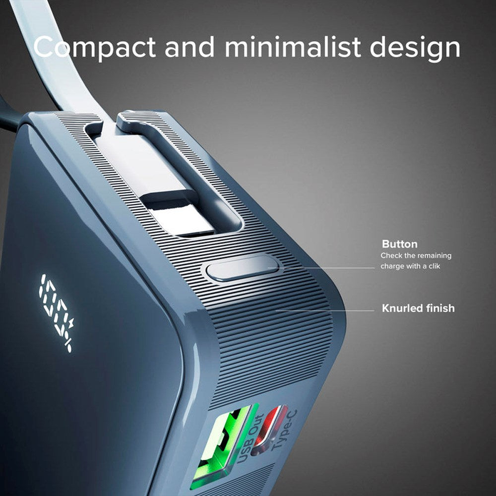 20W LCD PowerBank m. 1x USB-A & 1x USB-C - SBS - 10.000 mAh - Indbygget USB-C Kabel - Blå
