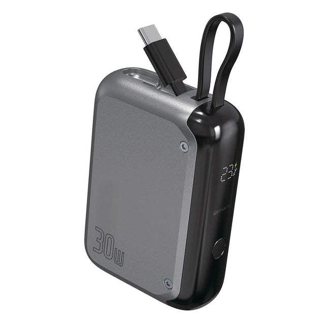 Pocket Powerbank 30W m. Innebygd USB-C-kabel - 10 000 mAh - Grå