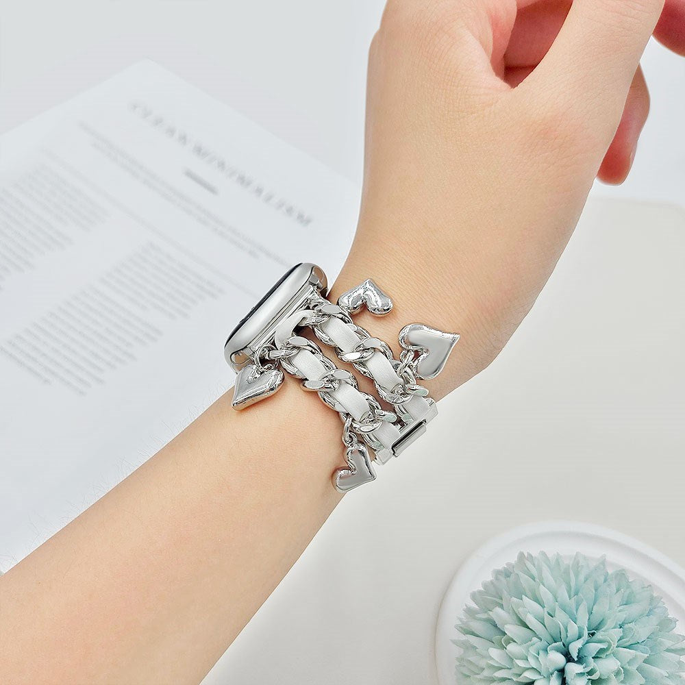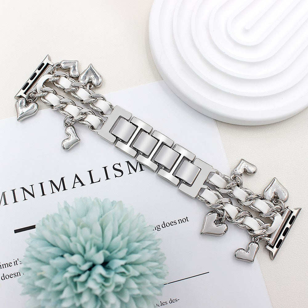 Opplev den perfekte blandingen av stil og romantikk med EIDERWOODs metallrem for Apple Watch (38 / 40 / SE / 41 / 42 mm). Denne stroppen skiller seg ut med en elegant vridd kjededesign som kombinerer slitesterkt metall og vegansk lær, og gir Apple Watch et sofistikert utseende. De vakre sommerfugl- og blomsteranhengene gir et feminint og unikt preg.