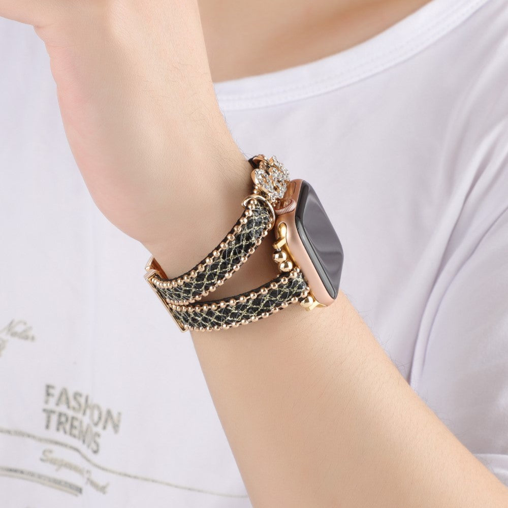 Apple Watch (38/40/SE/41/42 mm) Klokkereim i metall og lær m. Rhinestone - Gull / Svart