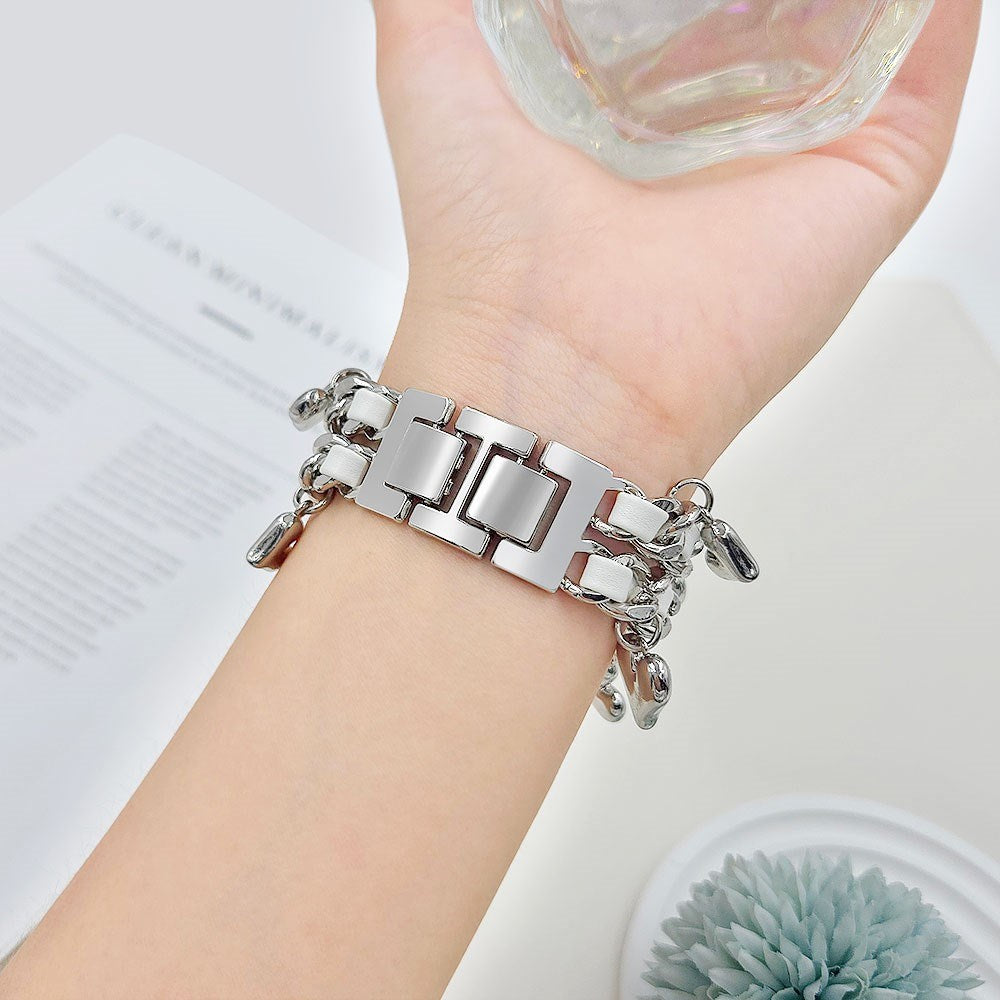 Opplev den perfekte blandingen av stil og romantikk med EIDERWOODs metallrem for Apple Watch (42 / 44 / SE / 45 / 46 / 49 mm). Denne stroppen skiller seg ut med en elegant vridd kjededesign som kombinerer slitesterkt metall og vegansk lær, og gir Apple Watch et sofistikert utseende. De vakre sommerfugl- og blomsteranhengene gir et feminint og unikt preg.