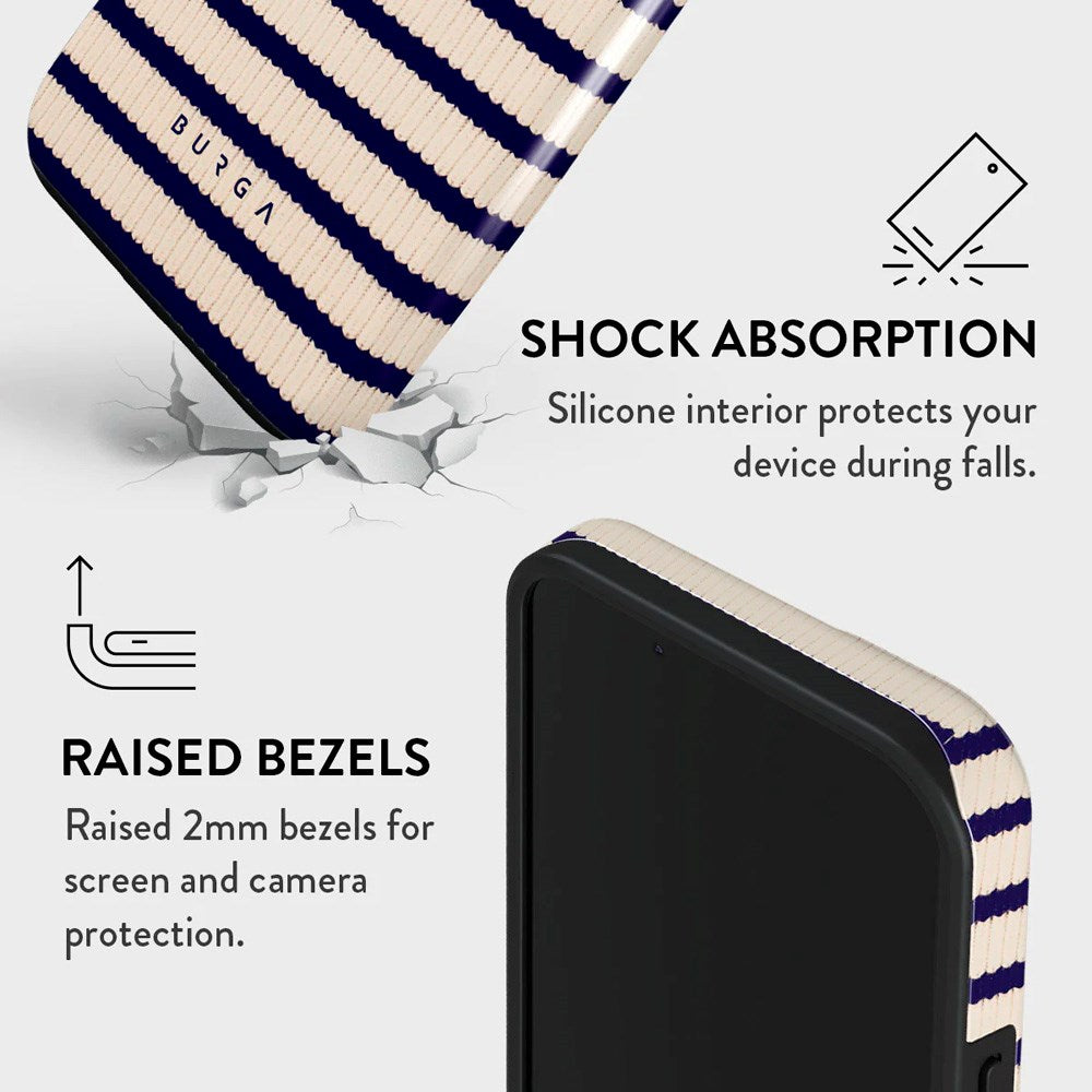 Burga kombinerer et flott utseende med eksepsjonell beskyttelse i denne saken. Dekselet består av et hardt ytre skall laget av plast som beskytter mot støt og støt, samt et indre lag av støtdempende silikon for optimal sikkerhet.
