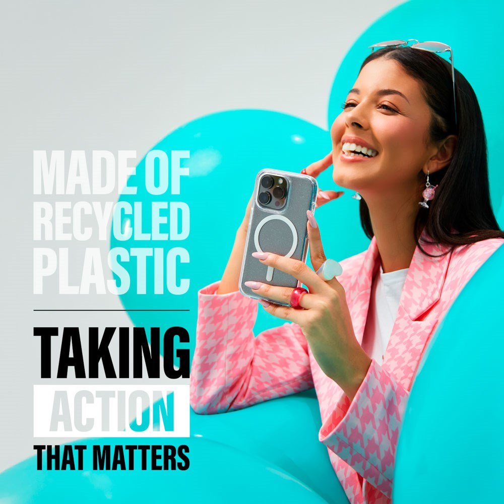 Dette iPhone 16e-dekselet er laget av resirkulerbar plast og har åpninger for høyttaler, kamera og blits, samt mulighet for å koble til en lader mens dekselet er på.