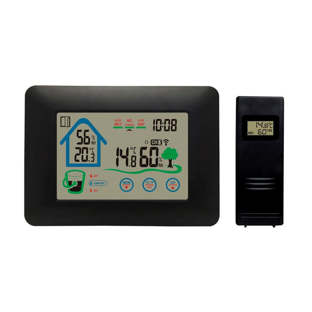 Med sit tydelige LCD-display viser den aktuelle temperatur og luftfugtighed for både inde- og udendørs omgivelser. Den trådløse sensor sender målinger i realtid med en rækkevidde på op til 50 meter, så du altid kan følge med i vejret udenfor.