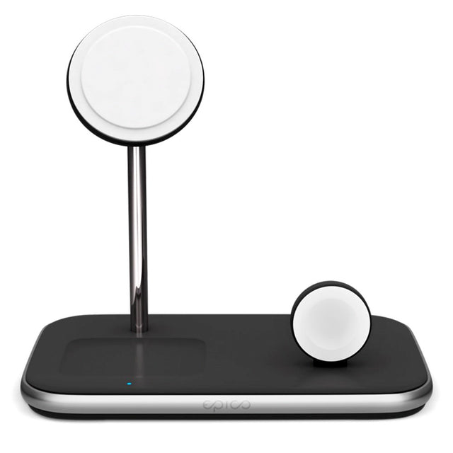 En stilig ladestasjon fra Epico som kan lade 3 forskjellige enheter. Med en slik stasjon slipper du å ha mange forskjellige ladekabler liggende. Denne ladedokken kan lade en Magsafe Mobile, en Apple Watch, en Airpods-ladeveske som støtter trådløs lading.