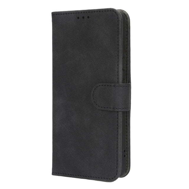 Et Google Pixel 7A- deksel laget av imitert skinn. Dette dekselet åpnes og lukkes vha. en magnet, og på innsiden er det et sort plastdeksel som smarttelefonen din skal plasseres i. I den andre delen av omslaget er det én stor lomme for sedler og to lommer for kredittkort eller lignende. Dekselet kan foldes sammen slik at det kan brukes som stativ, slik at du kan se filmer, serier eller andre ting uten å måtte holde telefonen.