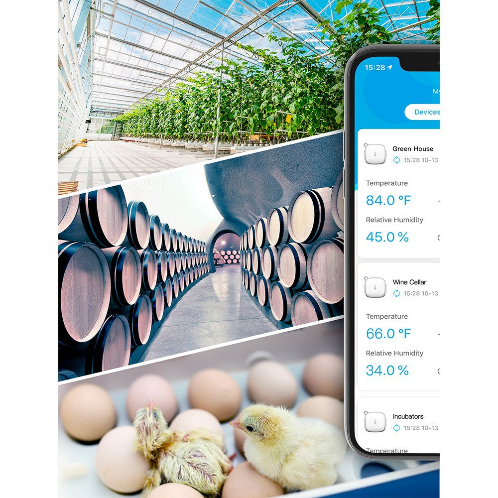 Via den medfølgende appen har du mulighet til å endre og tilpasse ulike innstillinger, alt fra din smarttelefon eller nettbrett. Still inn individuelle temperatur- og fuktighetsgrenser i appen og motta umiddelbare varsler hvis nivåene dine overskrides. Hold deg enkelt oppdatert.