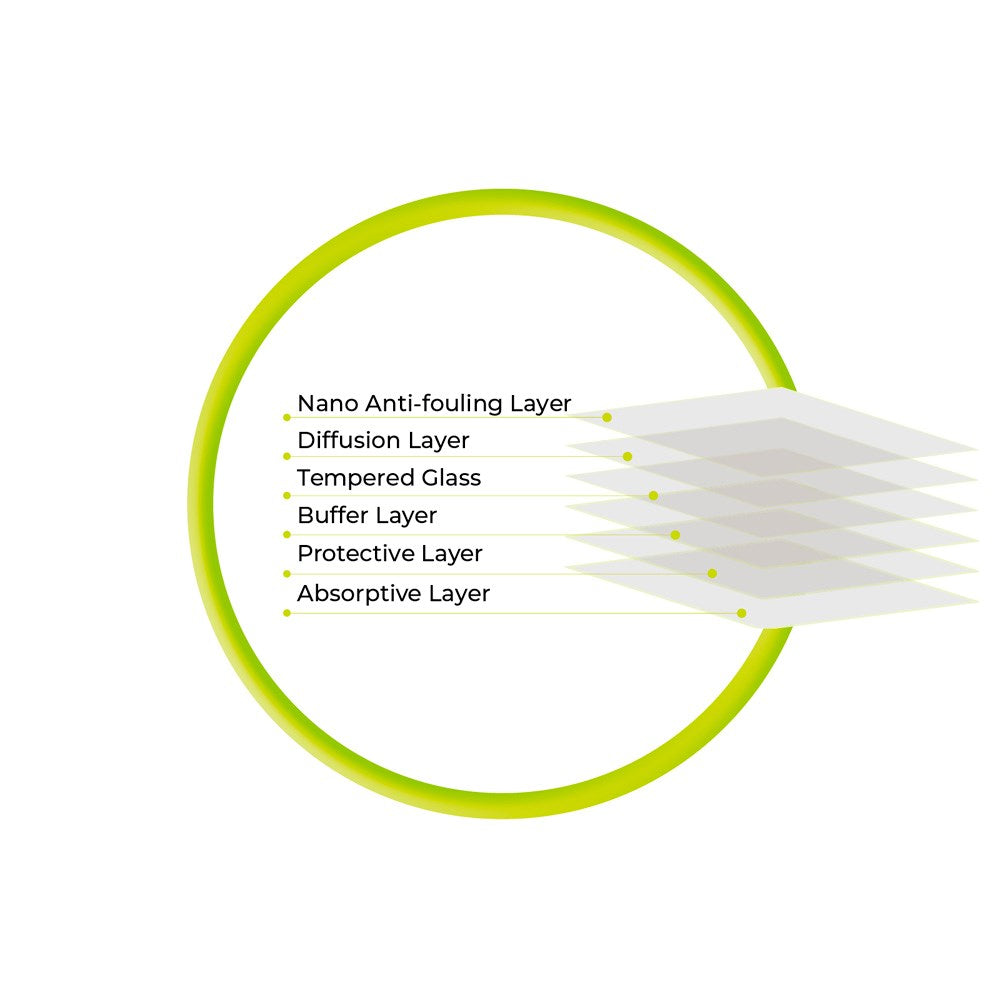 Det herdede glasset består av seks forskjellige lag, som til sammen gir sterk beskyttelse mot riper, støt og andre skader, samtidig som skjermens berøringsfølsomhet og klarhet opprettholdes.