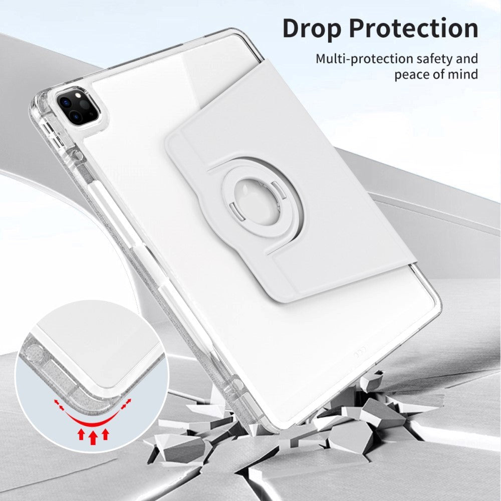 Baksiden av dekselet er konstruert med en blanding av robust og fleksibel plast som effektivt beskytter nettbrettet ditt mot skade. Den gjennomsiktige baksiden gir iPaden en stilig touch. I tillegg er det en smart innebygd holder for din Apple Pencil .