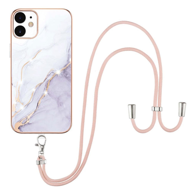 iPhone 12 / 12 Pro Marble Hybrid Bakdeksel m. Justerbar stropp - Hvit