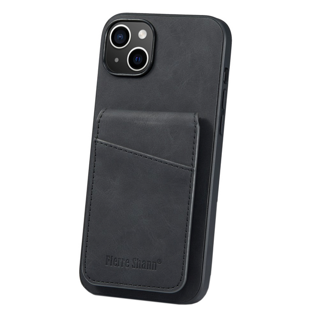 iPhone 13 skinnbelagt plastbakdeksel m. Kortholdere og stativfunksjon - Sort