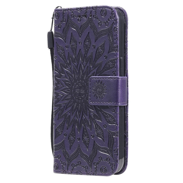 iPhone 15 Leather Flip Cover m. Veske og stropp - Mandala Flower - Lilla5712577191245 |