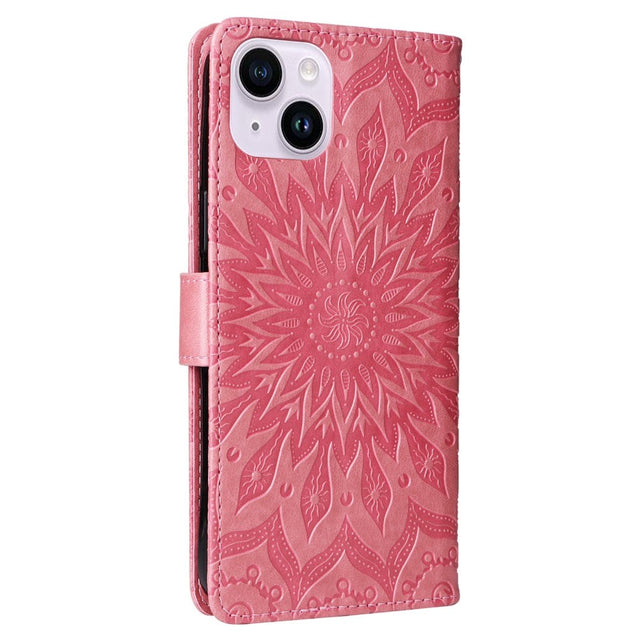 iPhone 15 Plus Leather Flip Cover m. Lommebok og stropp - Mandala Flower - Rosa