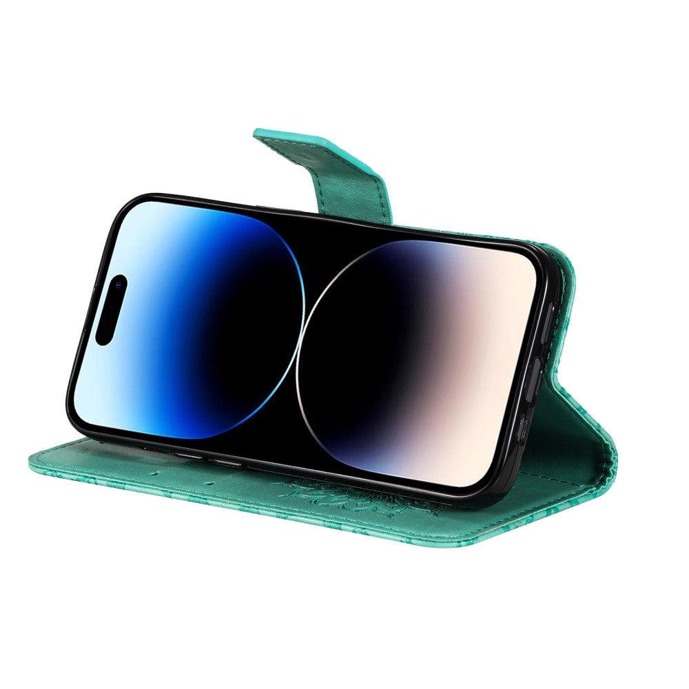 iPhone 15 Pro Leather Flip Cover m. Lommebok og stropp - Mandala Blomst - Grønn