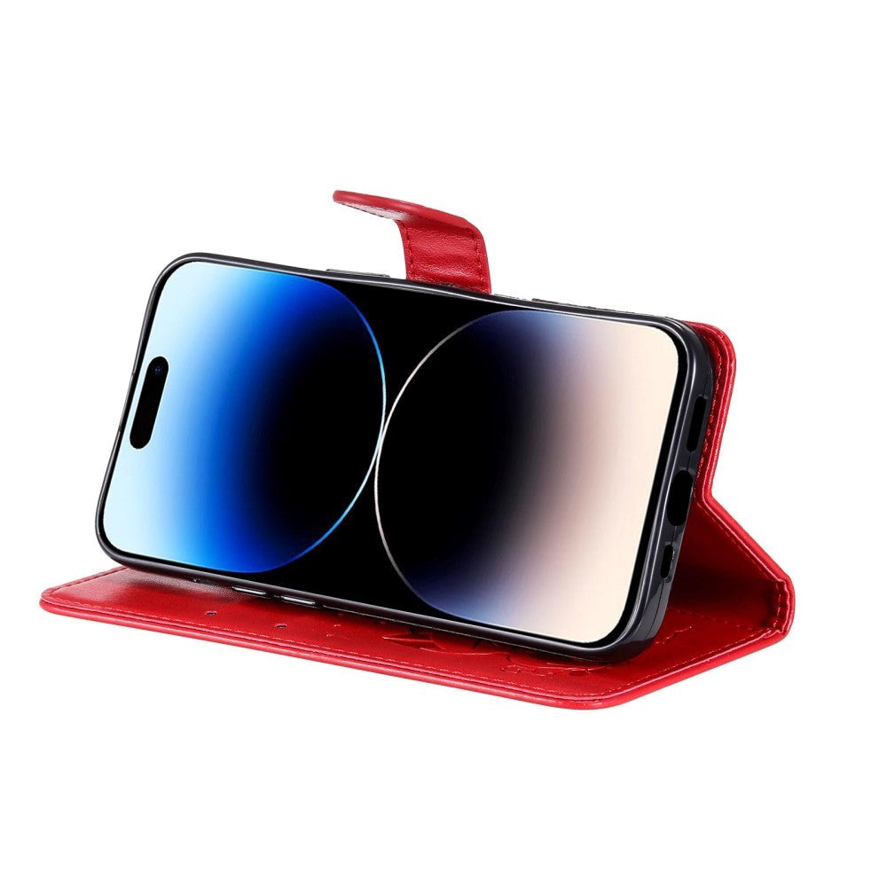iPhone 15 Pro Leather Flip Cover m. Lommebok og stropp - Kattegravering - Rød