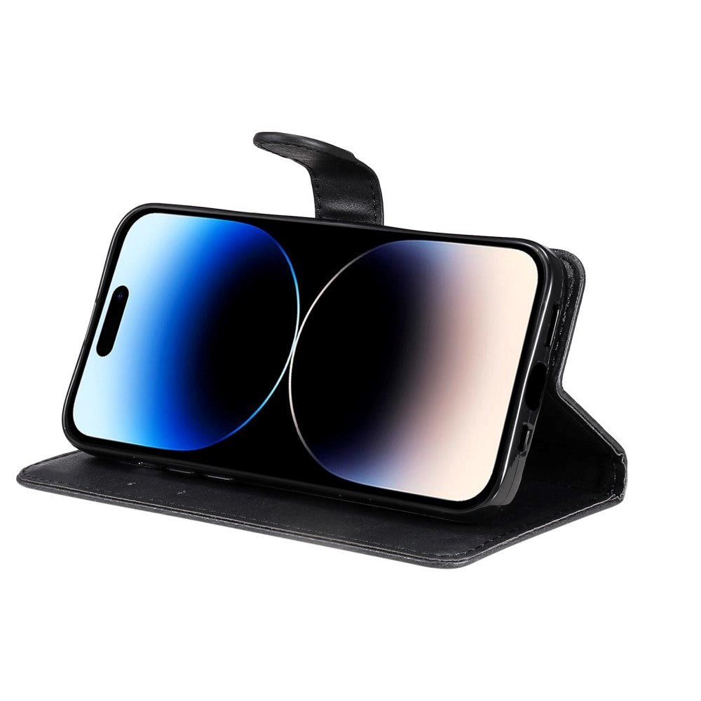 iPhone 15 Pro Leather Flip Cover m. Rem og lommebok - Svart