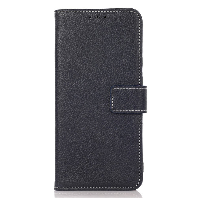 iPhone 15 Pro Litchi Leather Flip Cover m. Hvite sting og veske - mørkeblå er i restordre og vil bli sendt så snart det er på lager igjen.