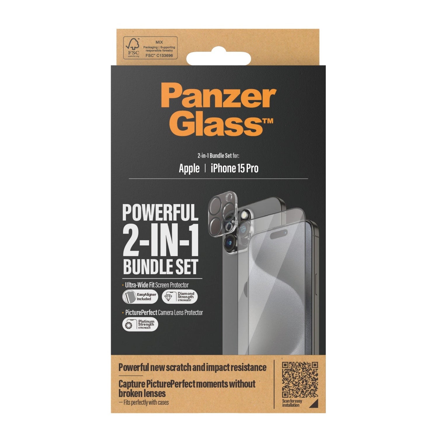 iPhone 15 Pro PanzerGlass 2-i-1-pakke m. EasyAligner - Skjermbeskytter / Kamerabeskytter - Gjennomsiktig / Svart