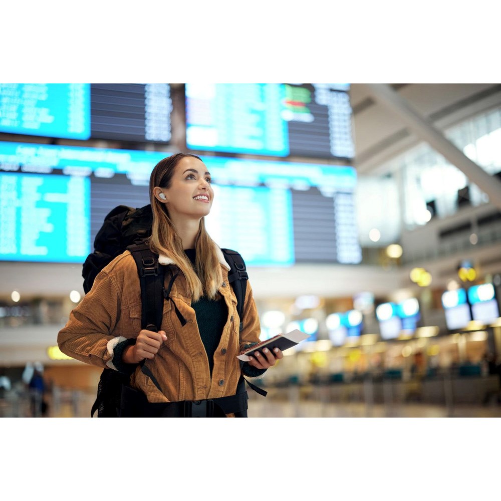 Høretelefonerne kommer i et praktisk opladningsetui, som både beskytter og holder styr på dem. Etuiet har desuden en lille strop, så du let kan hægte det fast på en taske, nøglering eller lignende, så du altid har dine høretelefoner lige ved hånden.