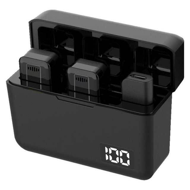 Sættet leveres i et praktisk opladningsetui, der både beskytter udstyret og sørger for, at mikrofonerne er opladet og klar til brug, når du har brug for dem.
