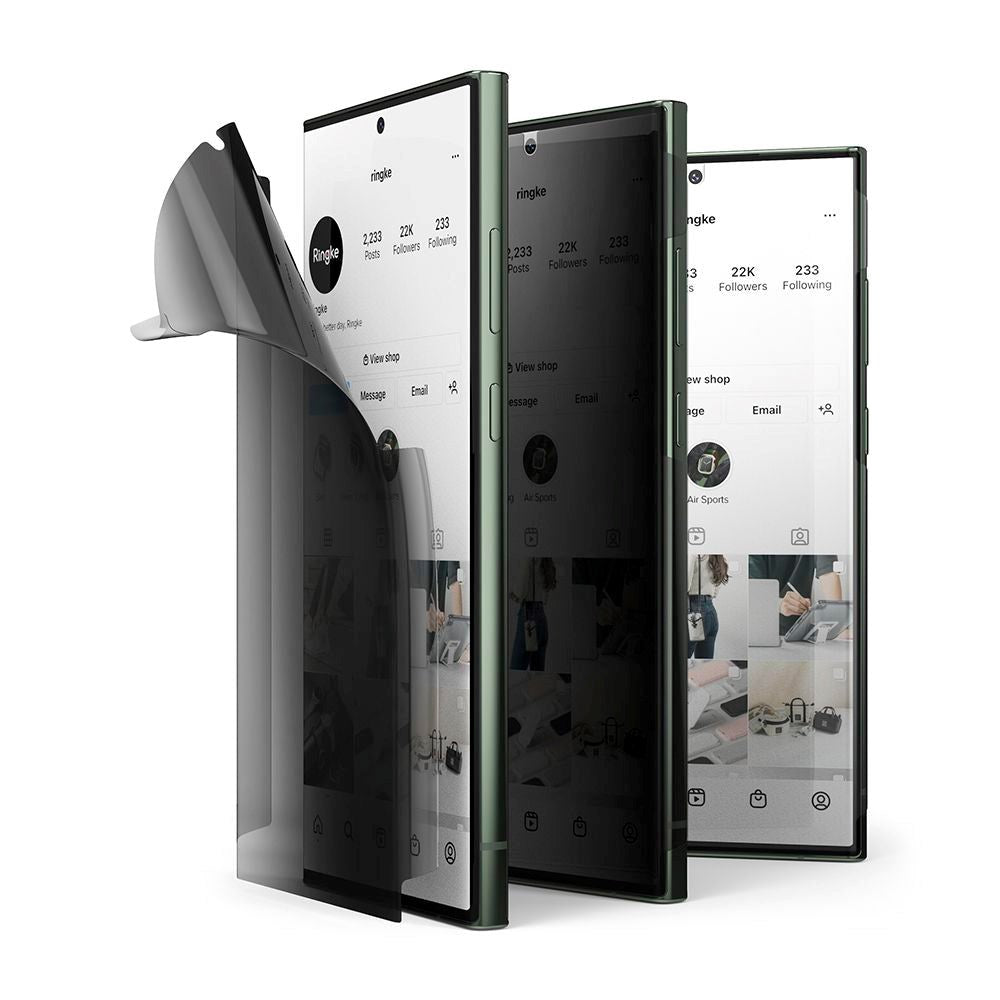 Her får du en beskyttelsesfilm fra Ringke med personvernfunksjon som dekker hele skjermen og til og med kantene på Samsung Galaxy S23 Ultra .