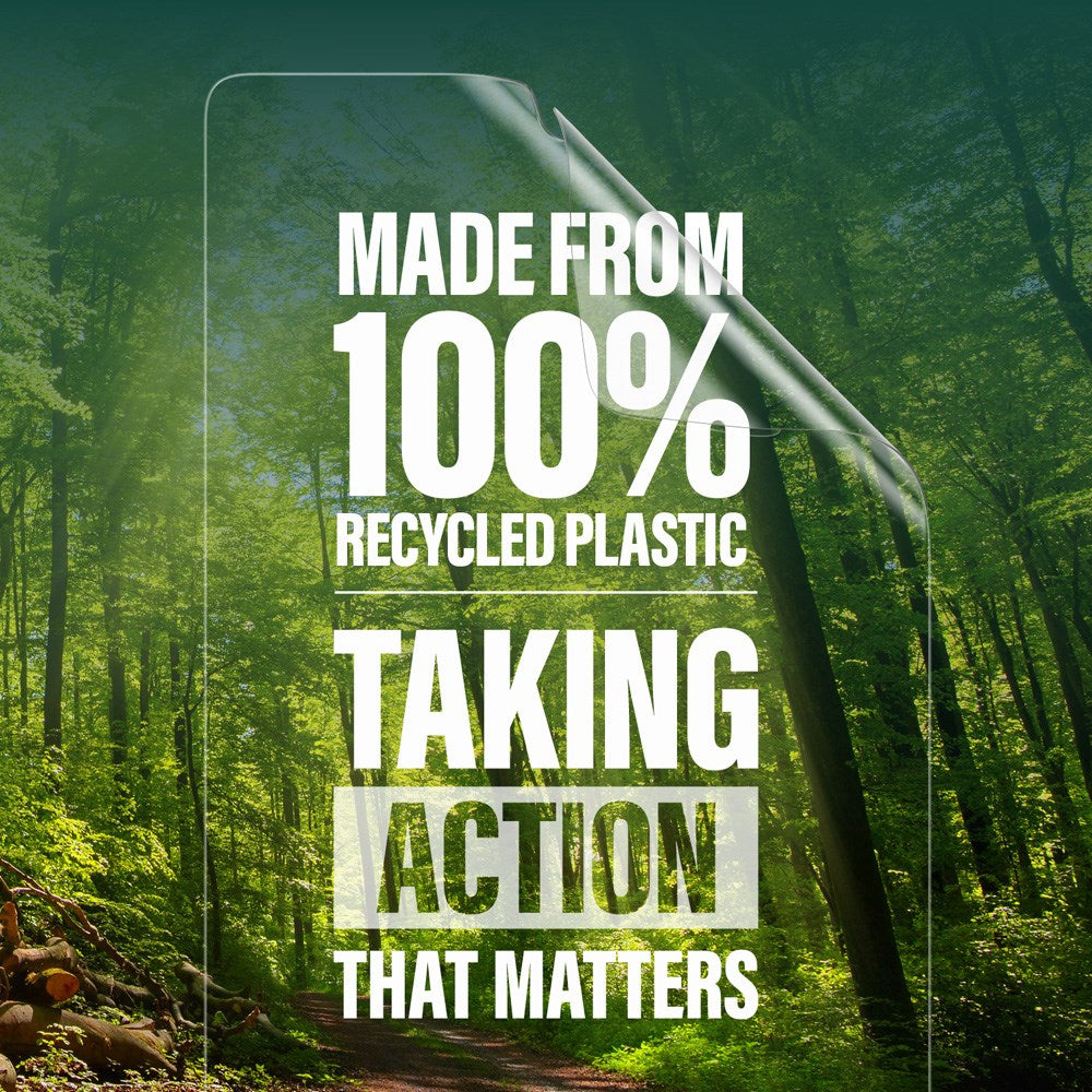 Skjermbeskytteren er laget av 100 % resirkulert plast og gir en eksepsjonell brukeropplevelse. Den beskytter telefonen mot utilsiktede støt og fall på harde overflater, samtidig som den opprettholder en slank og funksjonell passform. "Ultra Wide Fit" sikrer maksimal skjermdekning samtidig som du fortsatt kan bruke et etui. Belegget på glasset reduserer fingeravtrykk og har en antibakteriell effekt som eliminerer opptil 99,99 % av bakteriene på overflaten.
