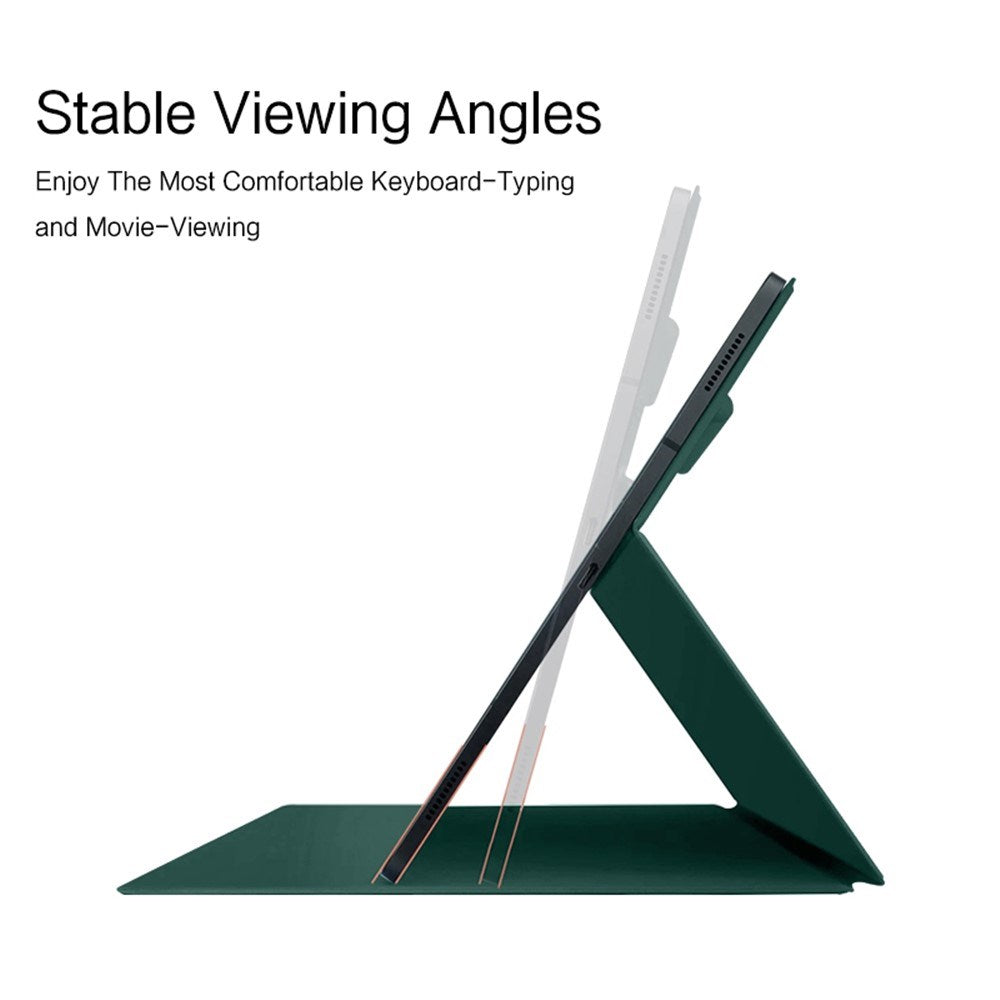 Det magnetiske stativ giver stabile visningsvinkler, mens auto wake/sleep-funktionen hjælper med at spare batteri. Præcise udskæringer og hævet kamerabeskyttelse sikrer fuld funktionalitet, og den indbyggede penholder giver nem adgang til din pen.
