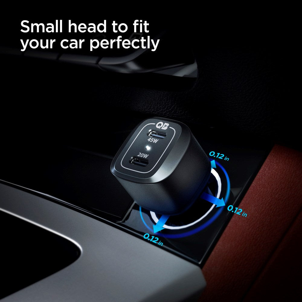 Med denne billaderen fra Spigen kan du alltid komme frem til destinasjonen med fulladede batterier. Du kan bruke de to USB-C-portene til å lade enhetene dine.