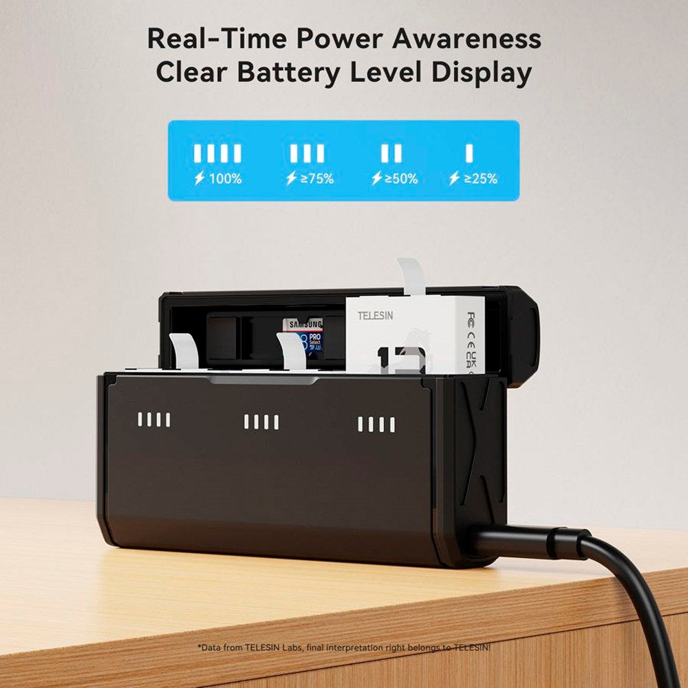Få mest muligt ud af dine optagelser med TELESIN Batteri Opladningscase & 2x Stamina Batteri Kit til GoPro Hero 13. Den kompakte og robuste oplader kan lade tre batterier og opbevare to microSD-kort, så du altid har ekstra strøm og lagerplads med dig.