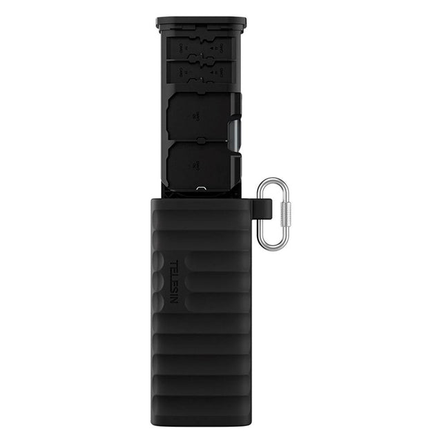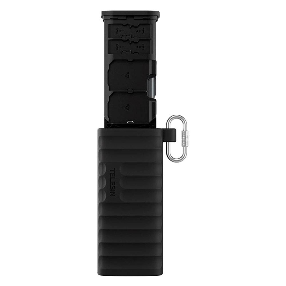 Den fungerer samtidig som opbevaringsetui med plads til 4 SD-kort, 6 MicroSD-kort og 2 Nano SIM-kort, så dine medier altid er organiserede og beskyttede. IP54-beskyttelse, slidstærkt design og karabinhage gør den ideel til professionelle på farten.
