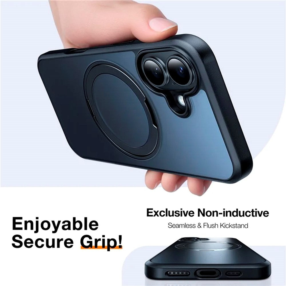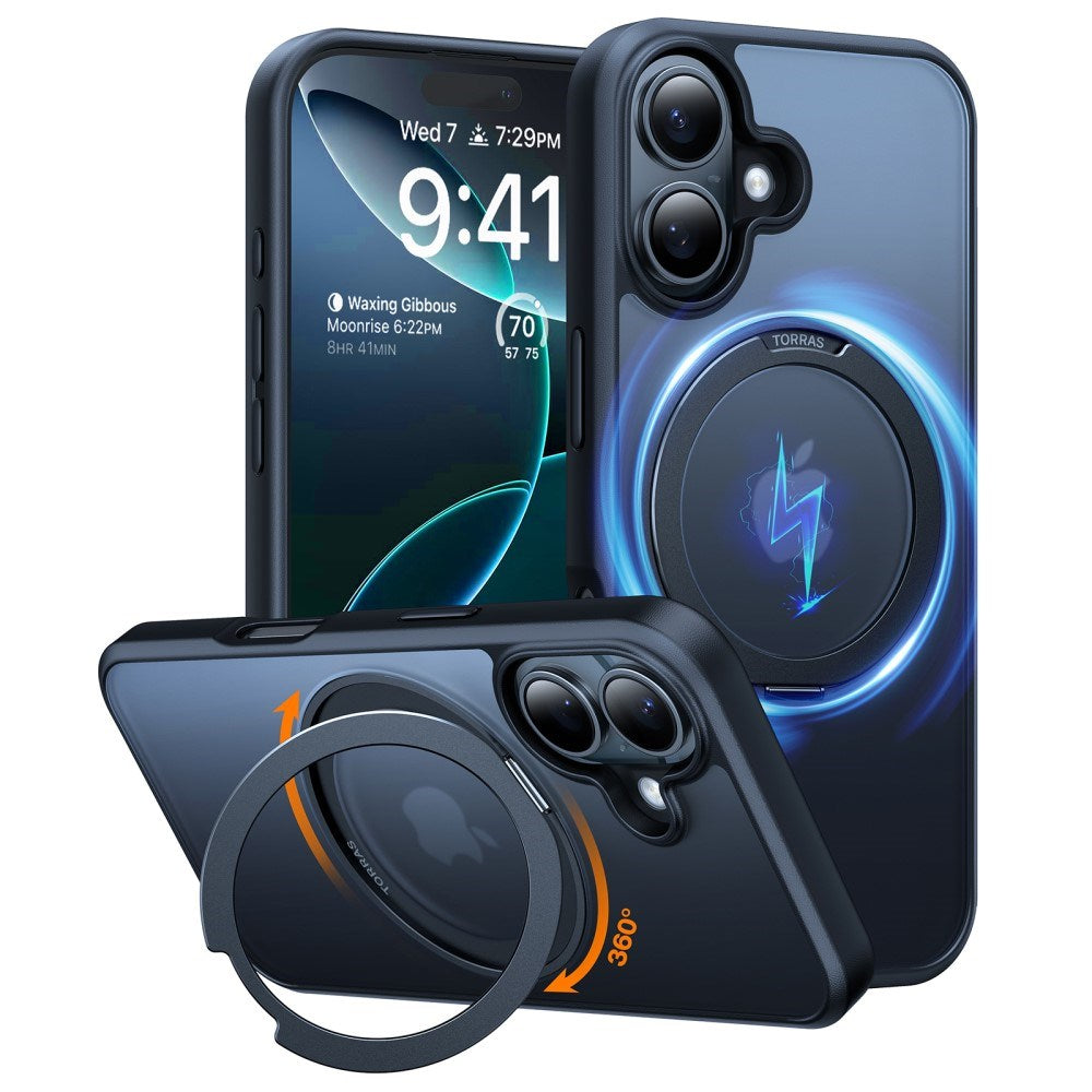 iPhone 16 Torras fleksibelt plastdeksel med justerbart ringstativ - MagSafe-kompatibel - svart / gjennomsiktig