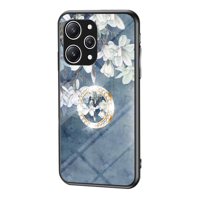Xiaomi Redmi 12 (4G) plastbakdeksel m. Glass Back & Finger Ring - Blomstertrykk - Blå