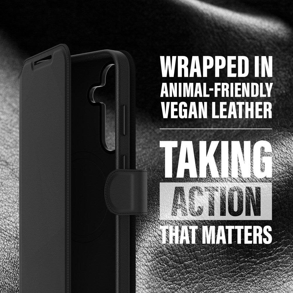 Samsung Galaxy S25+ (Plus) coveret er produceret i kunstlæder (flipcoveret) og genanvendt plastik (bagsidecoveret), hvilket sørger for en lækker overflade og god holdbarhed.