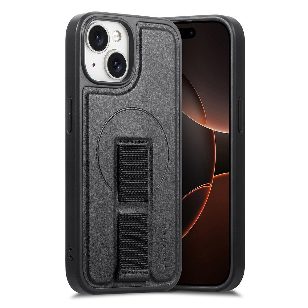 iPhone 15 - Hårdt Plastik Cover m. Kunstlæder Bagside & Fingerrem - MagSafe Kompatibel - Sort
