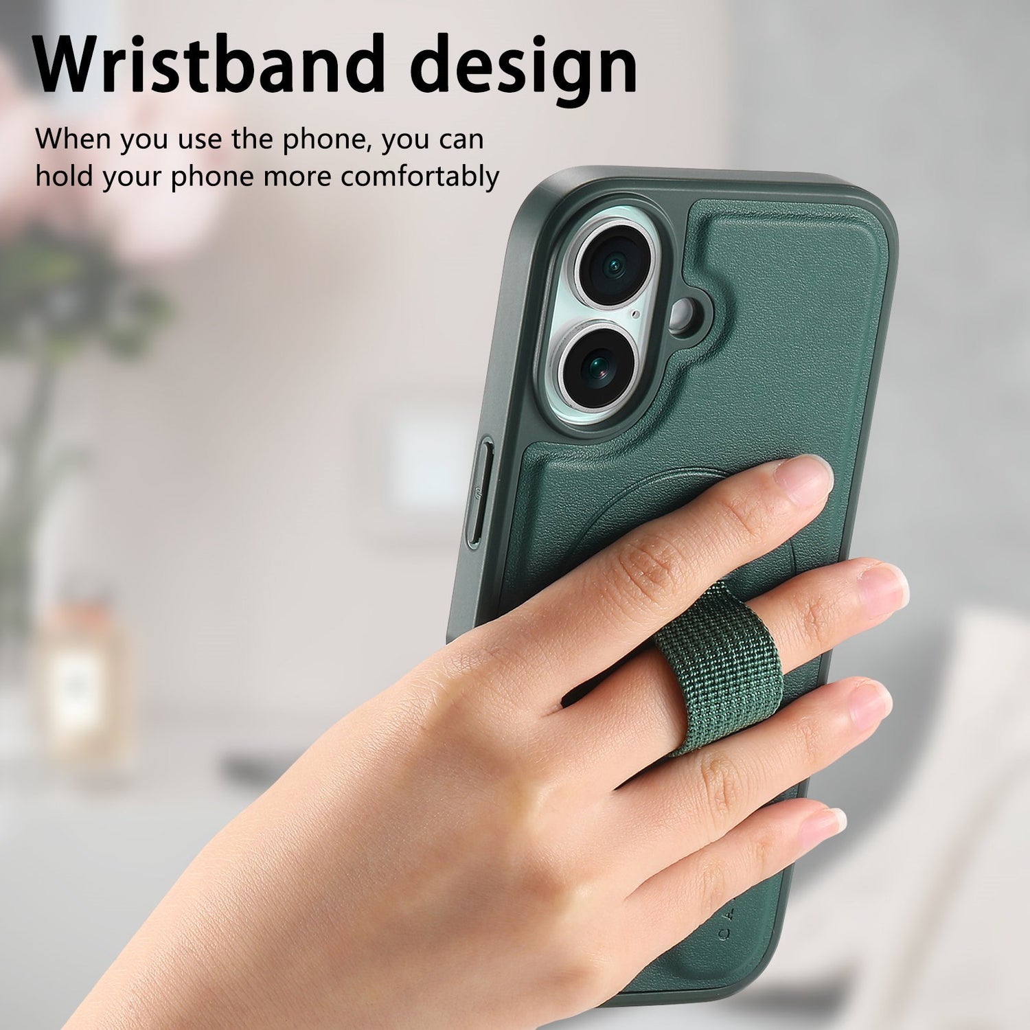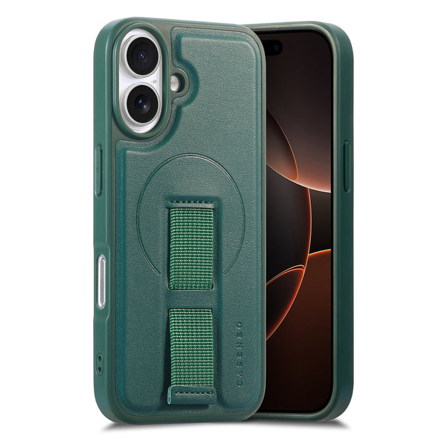 iPhone 16 - Hårdt Plastik Cover m. Kunstlæder Bagside & Fingerrem - MagSafe Kompatibel - Grøn