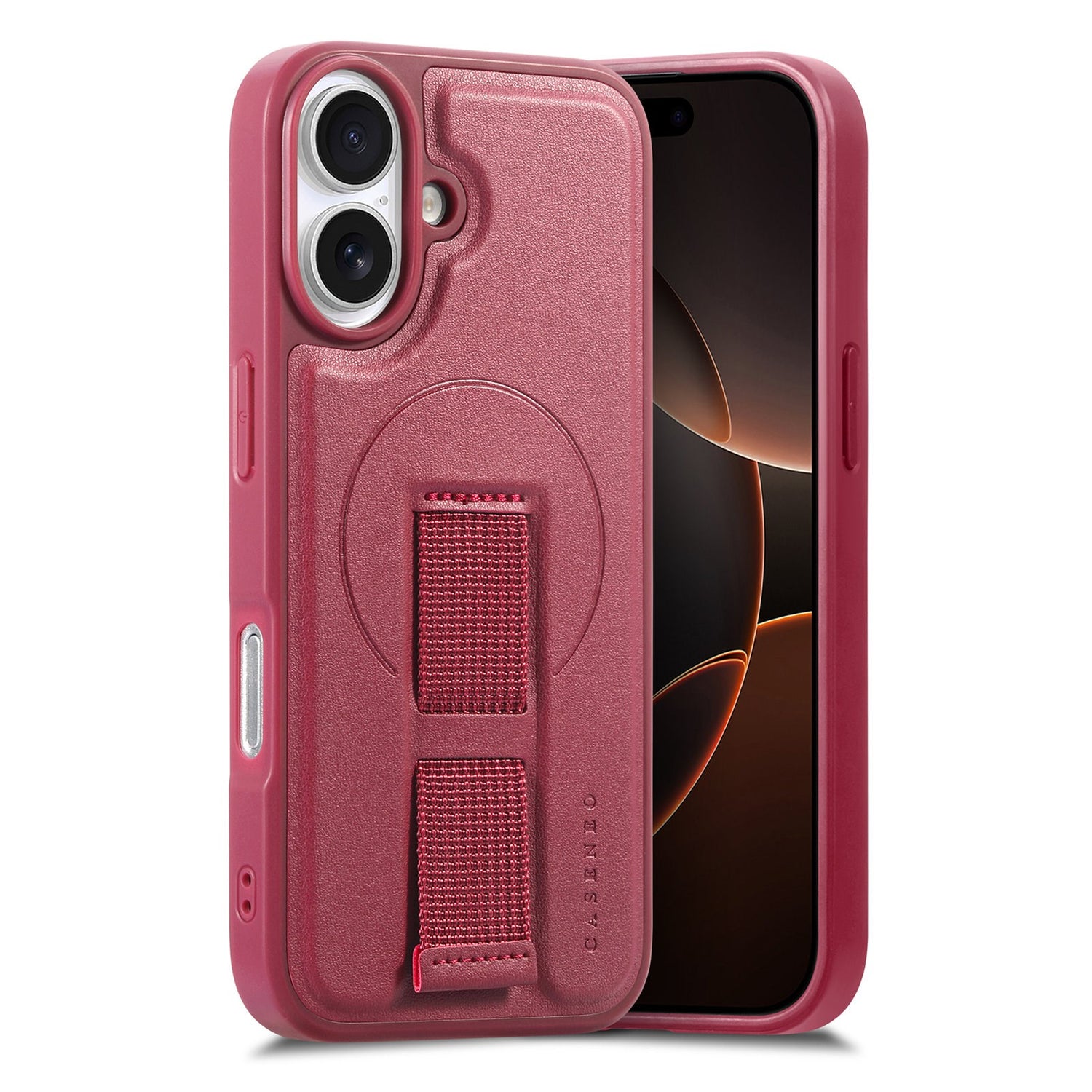 iPhone 16 - Hårdt Plastik Cover m. Kunstlæder Bagside & Fingerrem - MagSafe Kompatibel - Rød