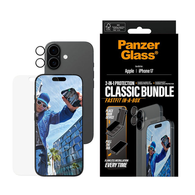 iPhone 17 PanzerGlass 2-in-1 Classic Bundle m. Classic Fit Skærmbeskyttelse & Hoops Kameralinsebeskyttelse - Gennemsigtig